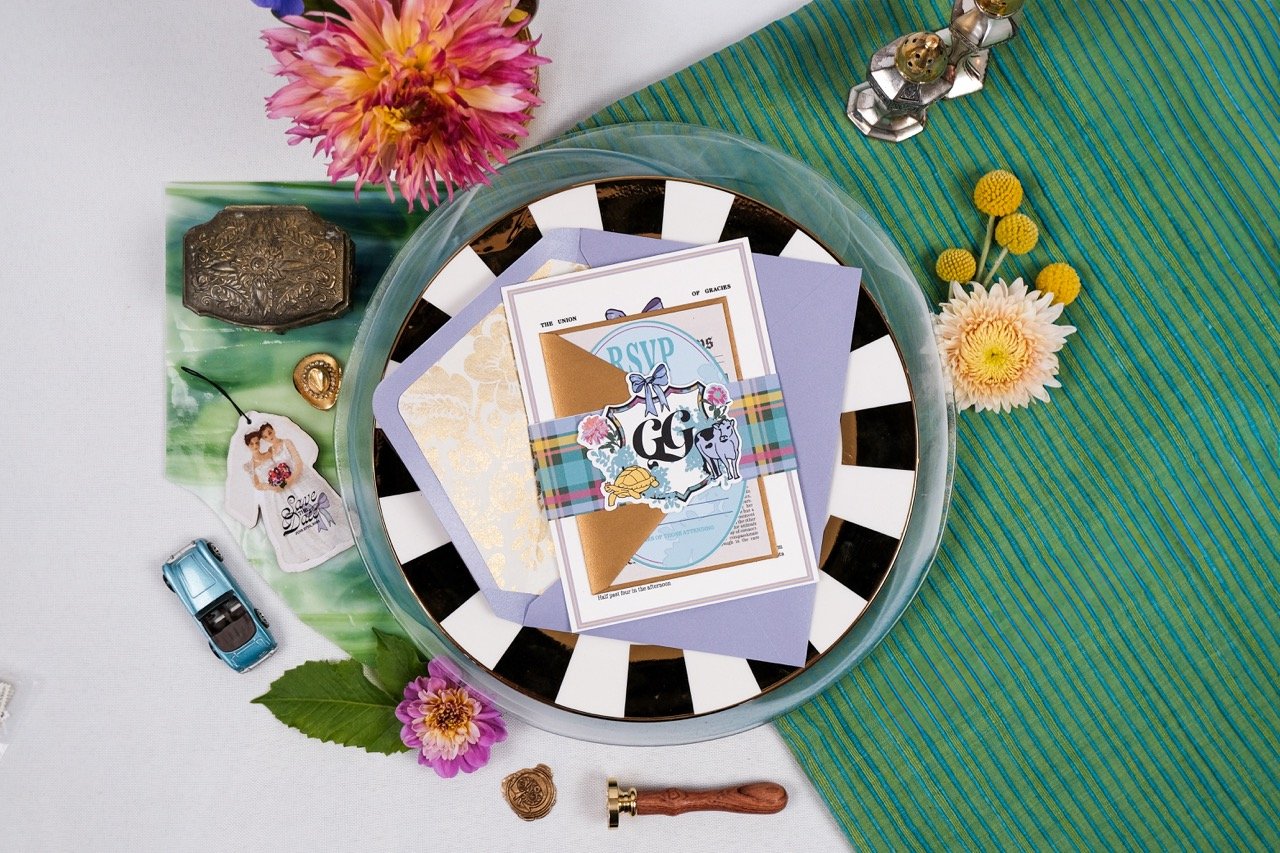 Designing Gracie and Gracie's wedding suite was all about capturing their vibrant love story with bold colors, playful details, and personal touches. From save-the-dates as car air fresheners to a custom crest inspired by their childhood nicknames, every piece reflected their unique story. A quirky newspaper shared their journey, complete with a custom "I Spy" game featuring their favorite things and inside jokes, making each detail joyful, sentimental, and uniquely them.