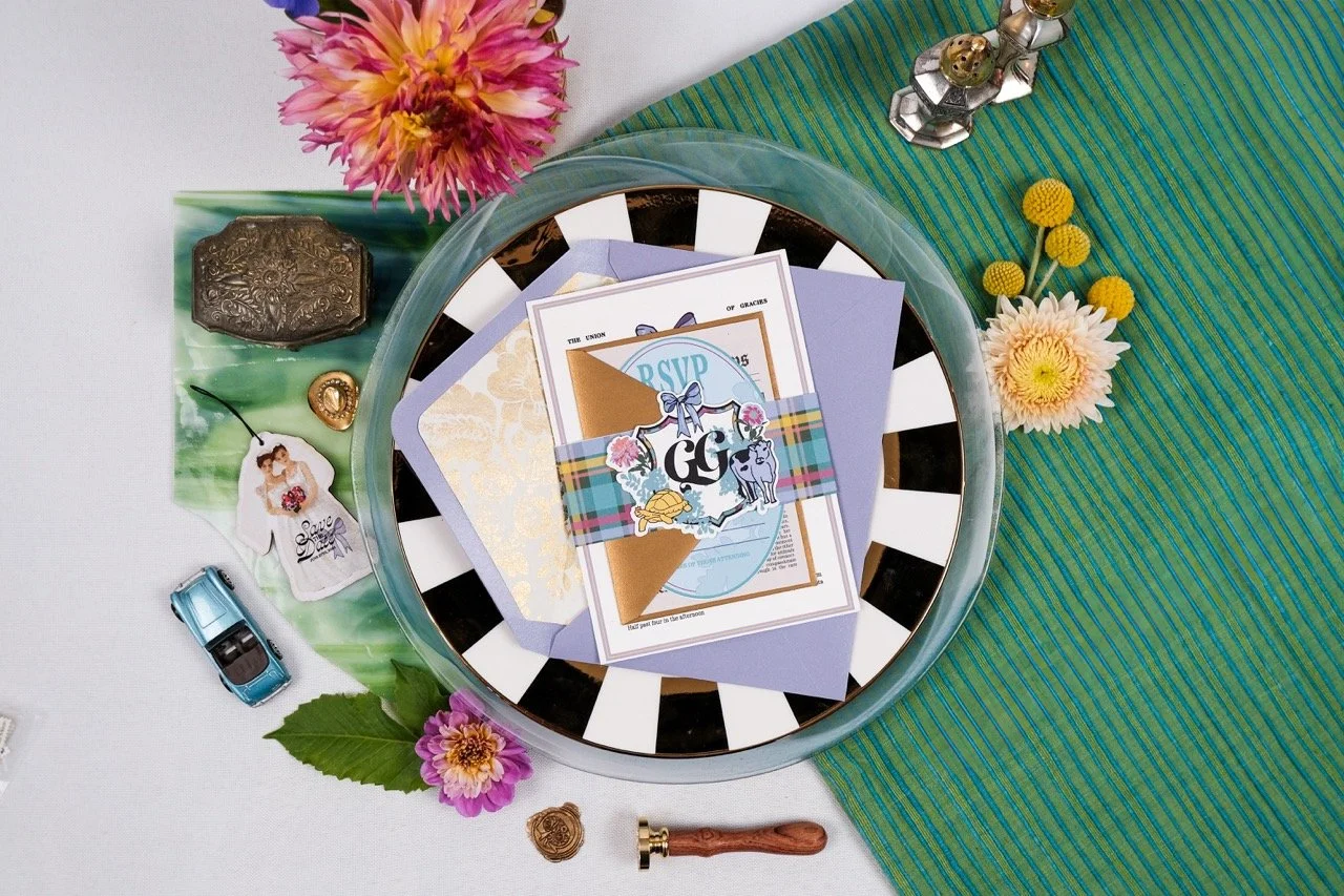 Designing a wedding suite filled with vibrant colors, textures, and playful elements, Gracie and Gracie was all about capturing this young couple’s personality. This project reflects my approach to custom stationery, where each detail mirrors the couple’s unique spirit.
